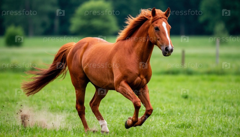 Огненная красная лошадь бежит по зеленому полю. Сгенерированный ИИ