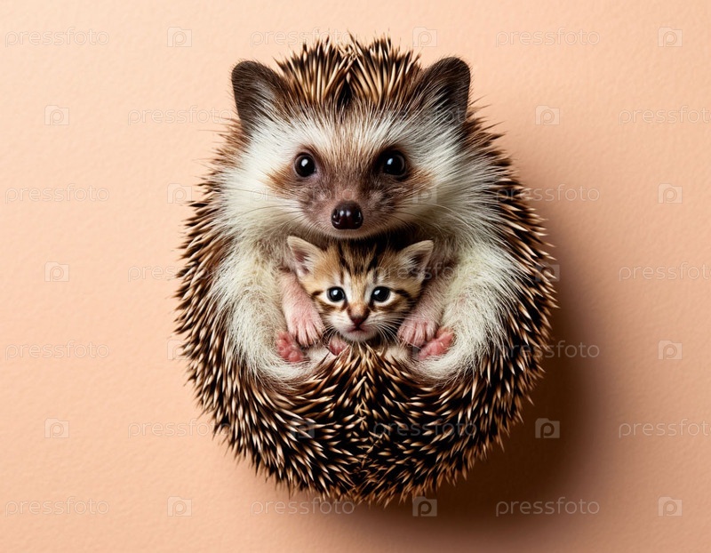 Ежик обнимает котенка на бежевом фоне. Генерируется ИИ