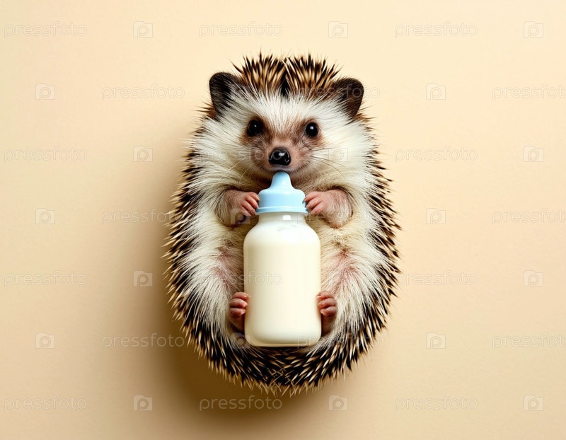 Ежик с бутылкой молока на бежевом фоне. Генерируется ИИ