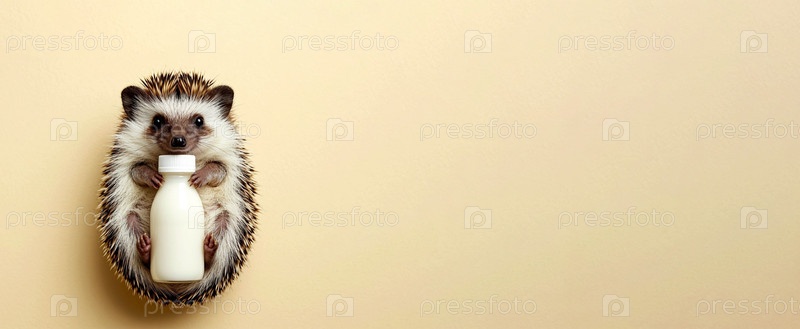 Ежик с бутылкой молока на бежевом фоне. Генерируется ИИ