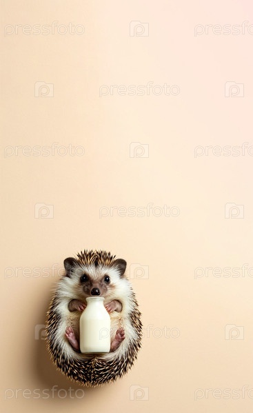 Ежик с бутылкой молока на бежевом фоне. Генерируется ИИ