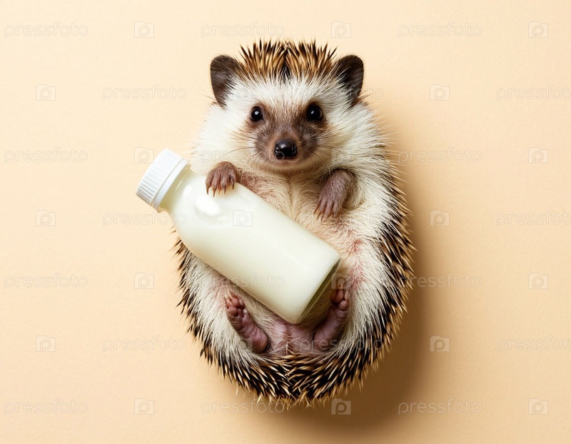 Ежик с бутылкой молока на бежевом фоне. Генерируется ИИ