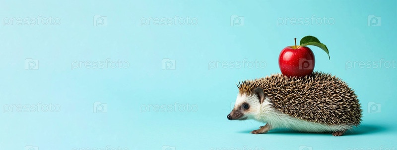 Еж с яблоком на спине на синем фоне. Сгенерированный ИИ