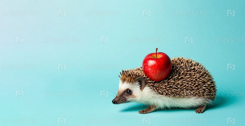 Еж с яблоком на спине на синем фоне. Сгенерированный ИИ