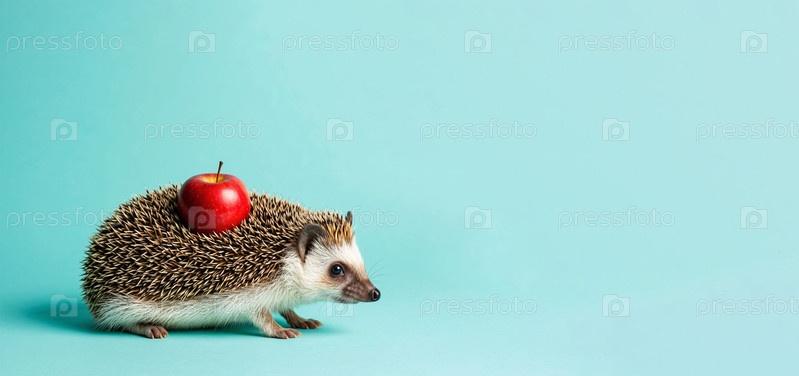 Еж с яблоком на спине на синем фоне. Сгенерированный ИИ