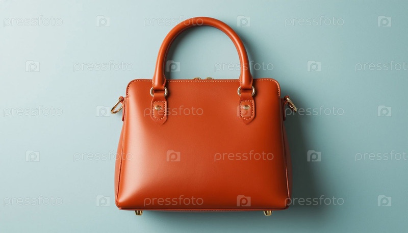 Женская кожаная сумка на пастельном серо-голубом фоне. Сгенерированный ИИ