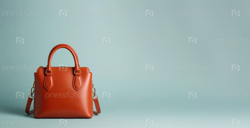 Женская кожаная сумка на пастельном серо-голубом фоне. Сгенерированный ИИ