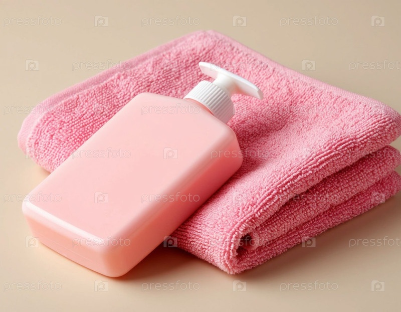 Полотенца, мыло и стиральный гель на бежевом фоне. Генерируется ИИ