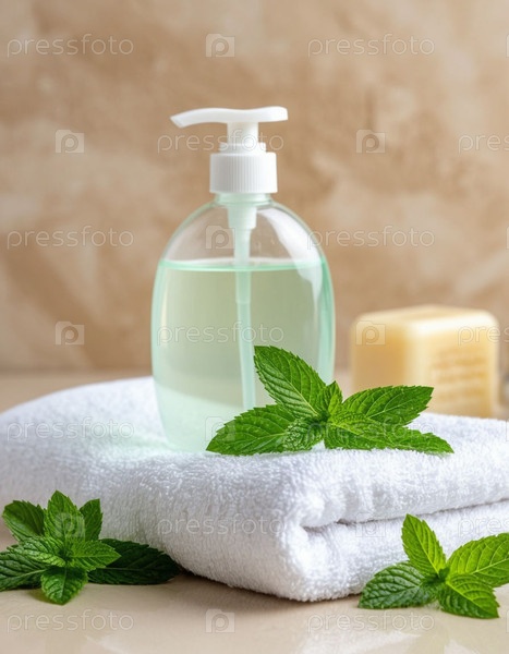 Полотенце и мятный очищающий гель на бежевом фоне. Генерируется ИИ