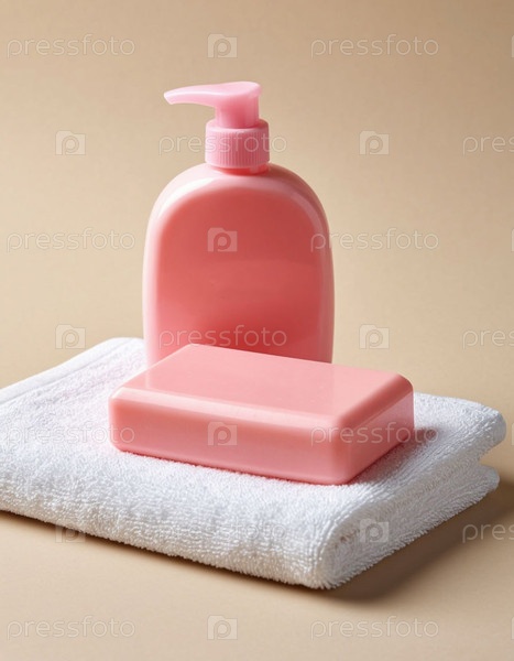Полотенца, мыло и стиральный гель на бежевом фоне. Генерируется ИИ