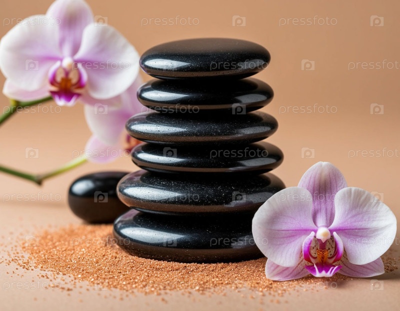 Массаж камней и орхидей для СПА на бежевом фоне. Генерируется ИИ