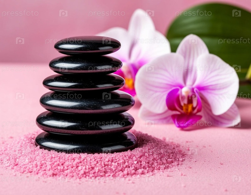 Массаж камней и орхидей для спа на розовом фоне. Генерируется ИИ