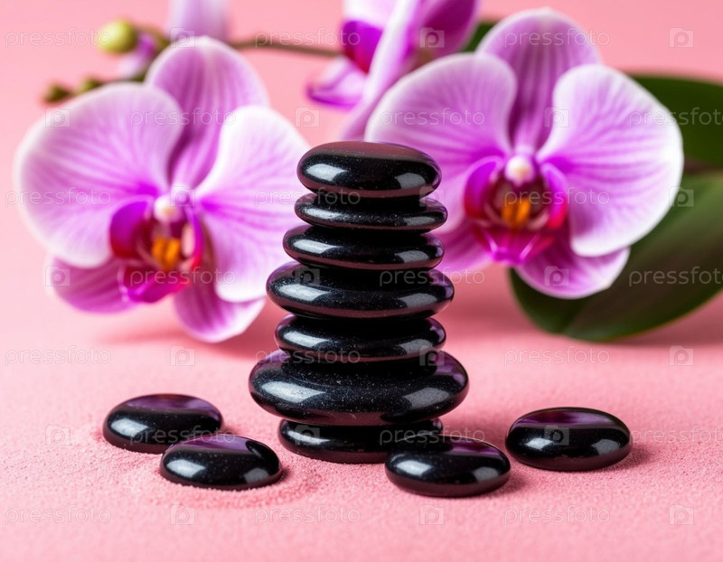 Массаж камней и орхидей для спа на розовом фоне. Генерируется ИИ