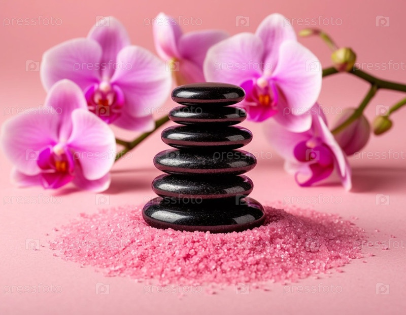 Массаж камней и орхидей для спа на розовом фоне. Генерируется ИИ
