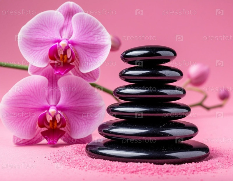 Массаж камней и орхидей для спа на розовом фоне. Генерируется ИИ