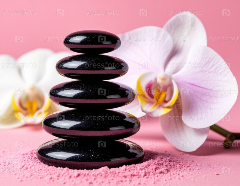 Массаж камней и орхидей для спа на розовом фоне. Генерируется ИИ