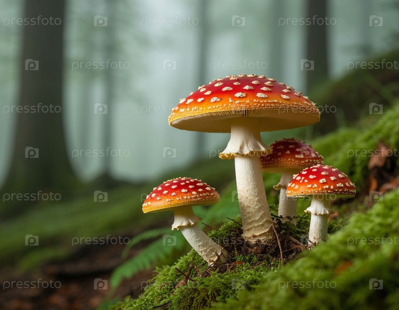 Летают агарные грибы крупным планом в лесу. Создан компанией AI.M
