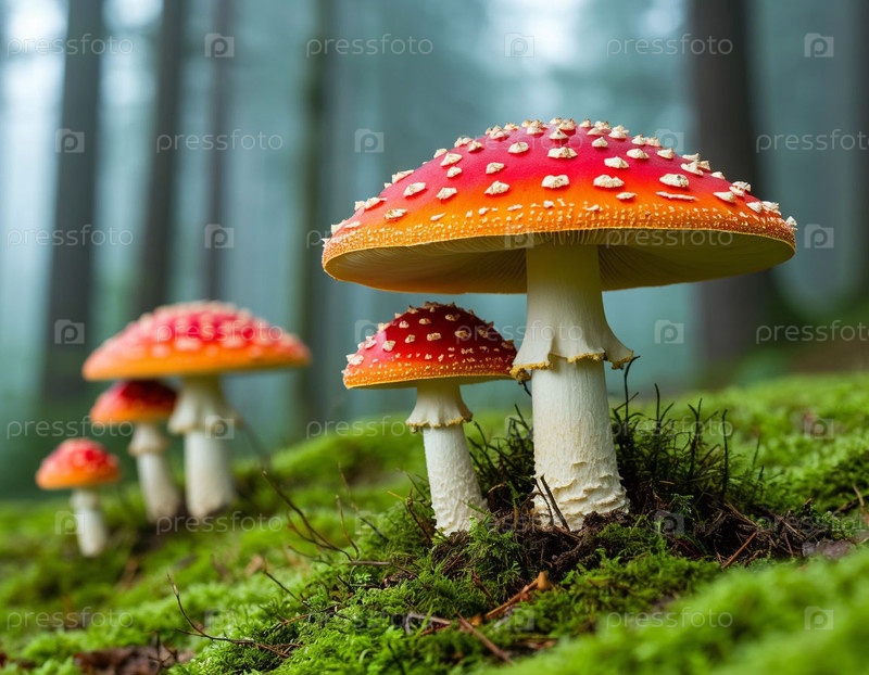 Летают агарные грибы крупным планом в лесу. Создан компанией AI.M