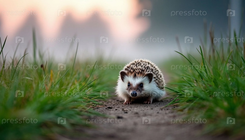 Еж на тропинке в поле в тумане. Сгенерированный ИИ