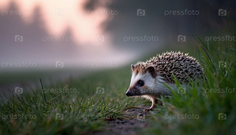Еж на тропинке в поле в тумане. Сгенерированный ИИ