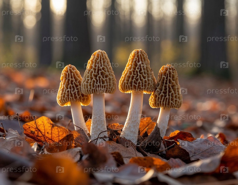 Морельские грибы крупным планом в лесу. Генерируется ИИ