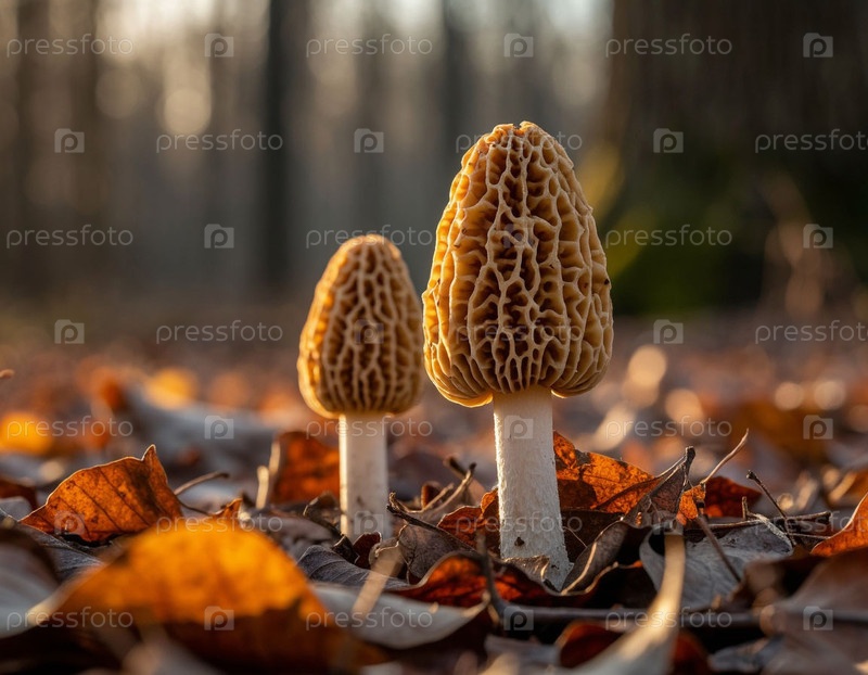Морельские грибы крупным планом в лесу. Генерируется ИИ