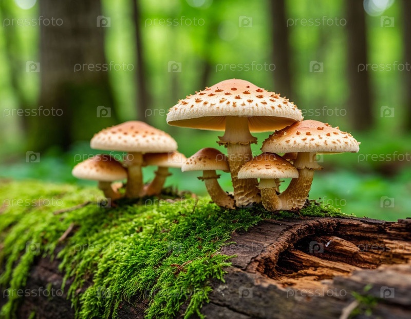 Медовые грибы на пеньке крупным планом в лесу. Сгенерированный ИИ