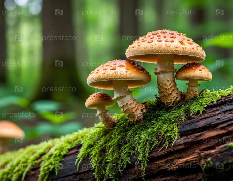 Медовые грибы на пеньке крупным планом в лесу. Сгенерированный ИИ