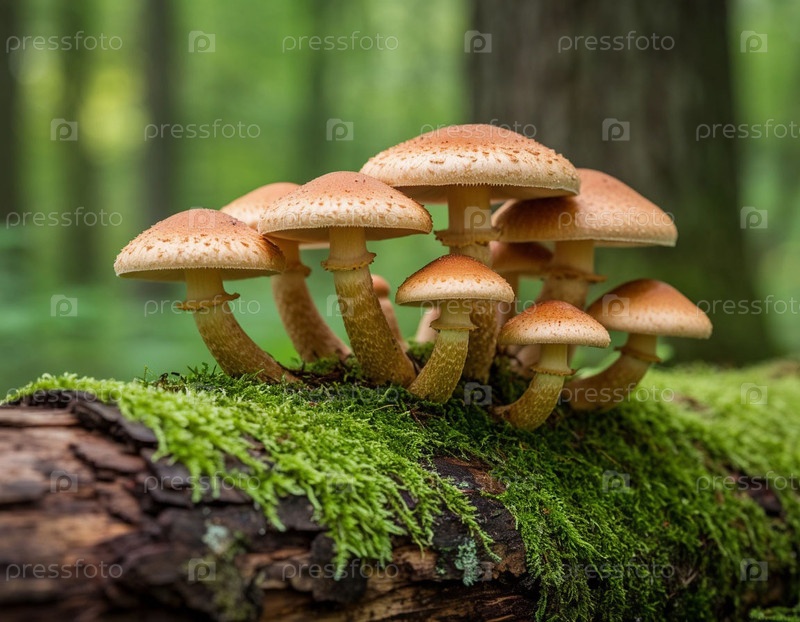 Медовые грибы на пеньке крупным планом в лесу. Сгенерированный ИИ