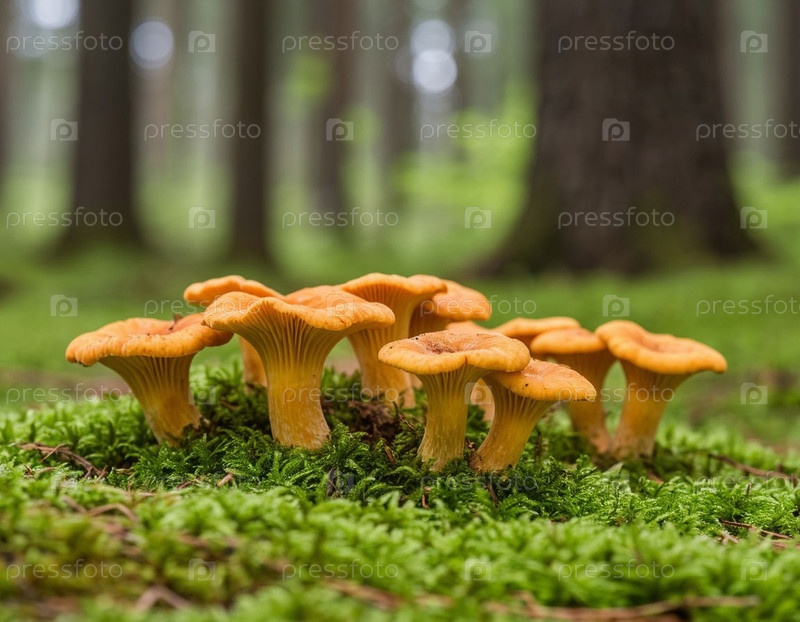 Шантерель грибы крупным планом в лесу. Сгенерированный ИИ