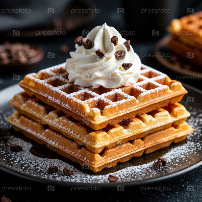 Вафли со взбитыми сливками на темном фоне. Генерируется ИИ