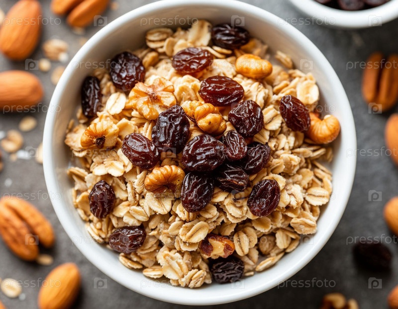 Овсянка с изюмом и орехами. Сгенерированный ИИ