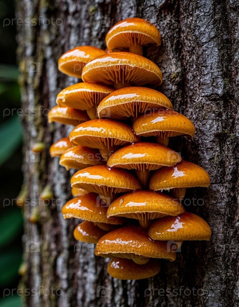 Медовые грибы на стволе дерева. Сгенерированный ИИ