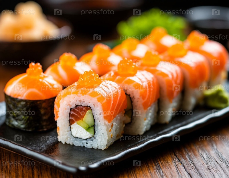 Японские роллы на столе. Сгенерированный ИИ