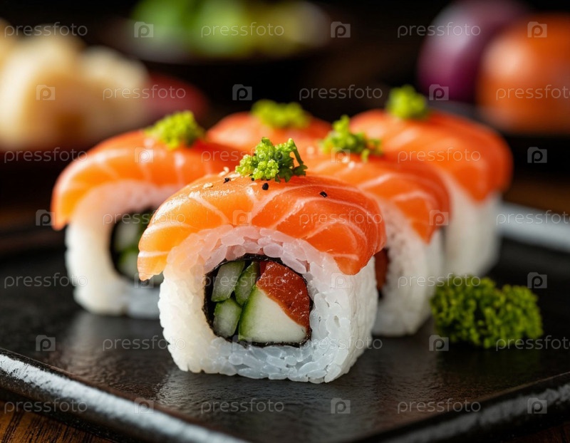 Японские роллы на столе. Сгенерированный ИИ
