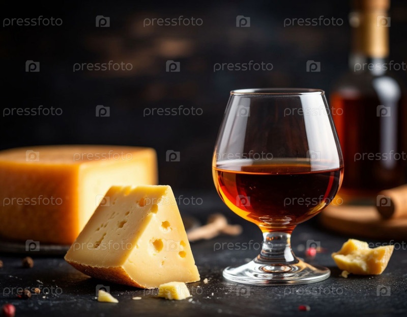 Коньяк в стакане и сыр на темном фоне. Генерируется ИИ