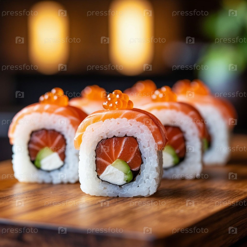 Японская еда, суши на столе. Сгенерированный ИИ