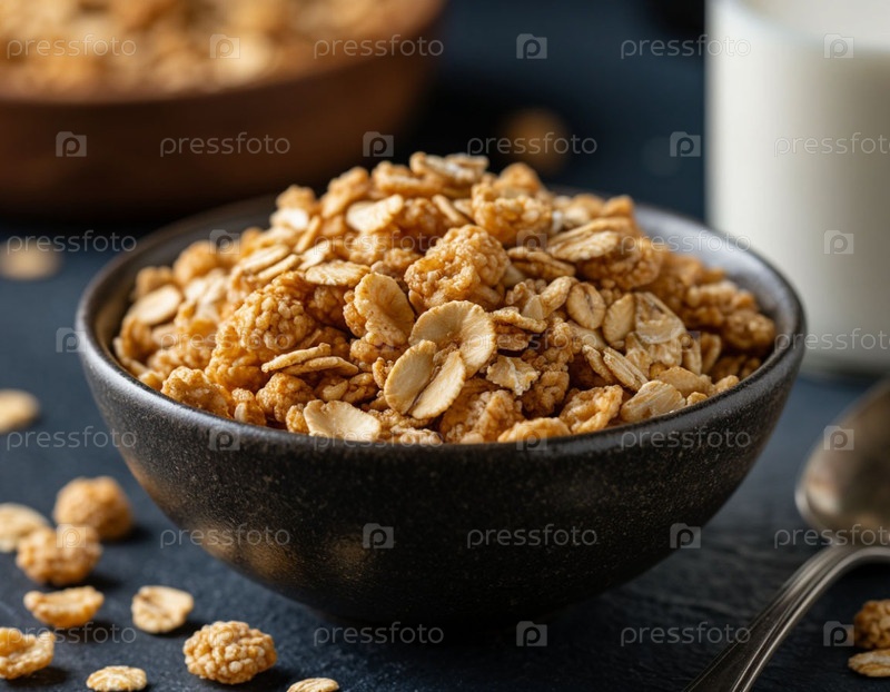Мюсли с молоком, здоровый завтрак на столе. Генерируется ИИ