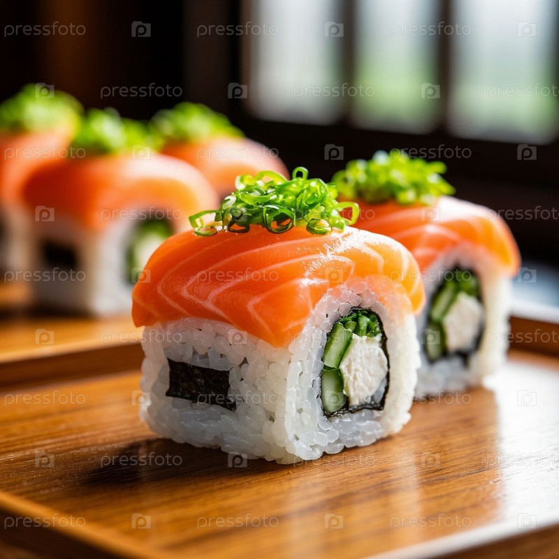 Японская еда, суши на столе. Сгенерированный ИИ