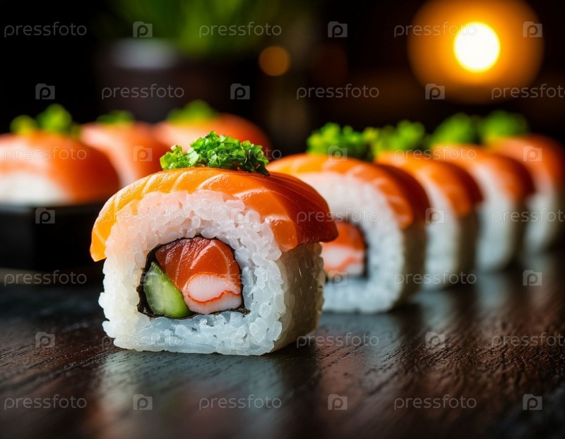 Японская еда, суши на столе. Сгенерированный ИИ
