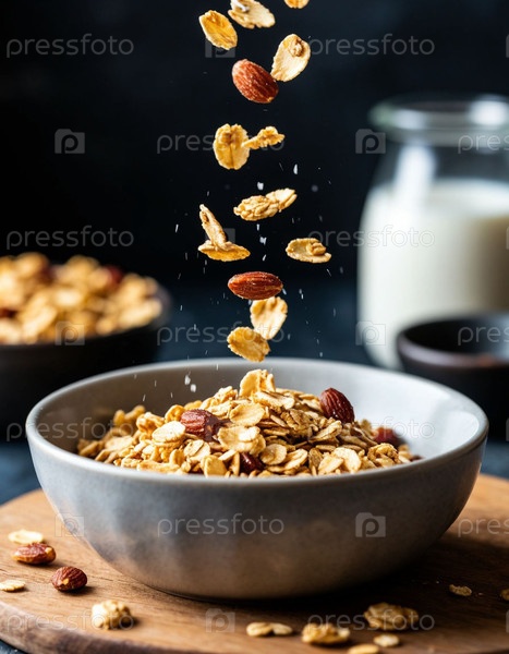 Мюсли с молоком, здоровый завтрак на столе. Генерируется ИИ