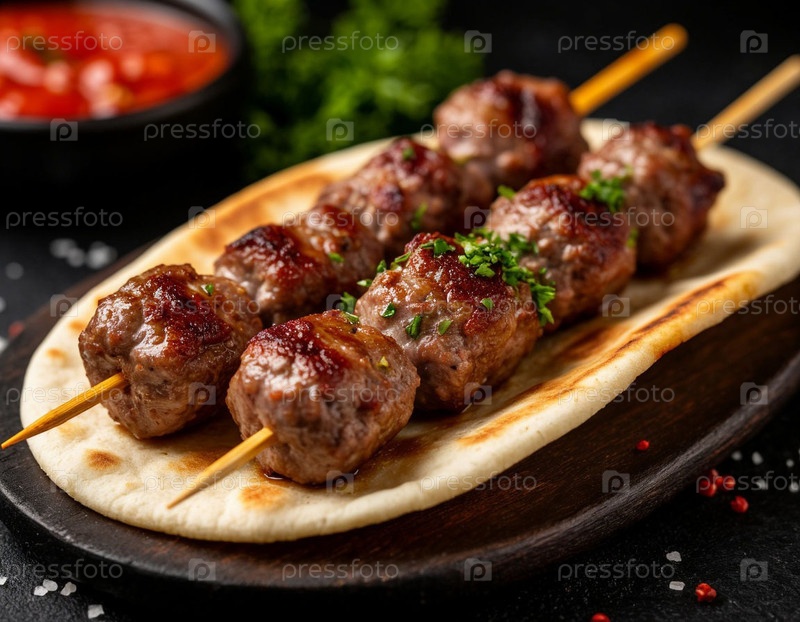 Шашлик на шашлыках на столе. Сгенерированный ИИ