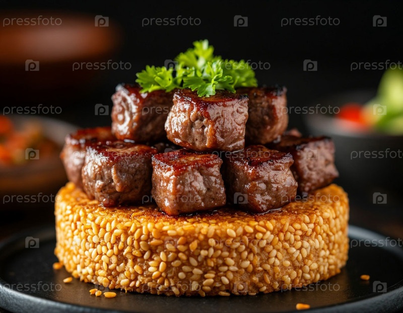 Кусочки шашлыка на булке из семян кунжута. Генерированный ИИ