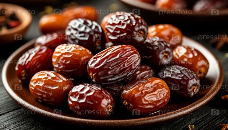 Даты в тарелке на столе. Сгенерированный ИИ