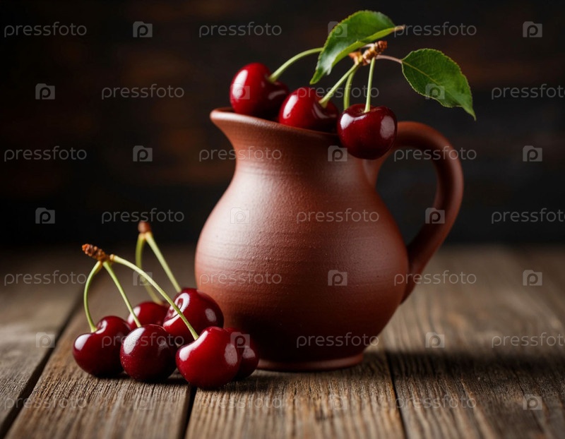Вишня в керамической кувшинке на темном фоне. ИИ