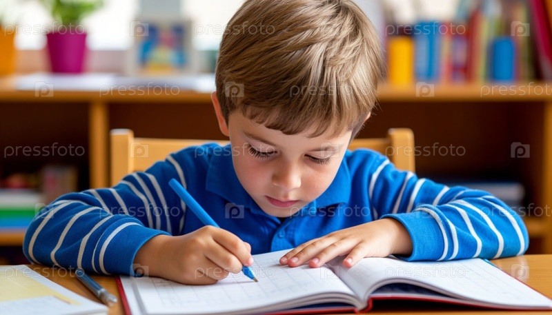 Маленький ребенок делает домашнее задание и пишет в блокноте. ИИ
