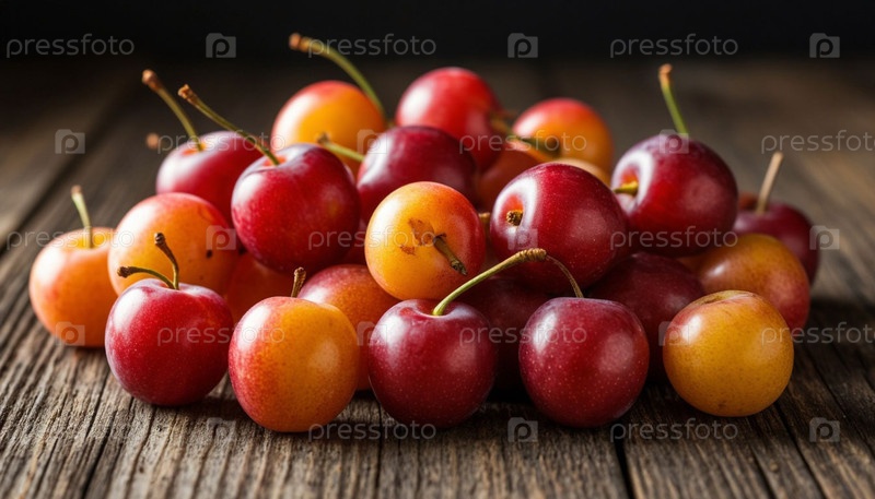 Вишневая слива на деревянном столе. ИИ