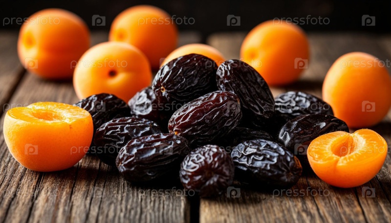 Чернослив и сушеные абрикосы на деревянном столе. ИИ