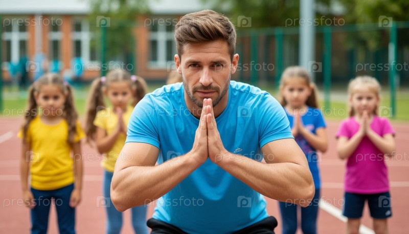 Учитель физкультуры делает упражнения с детьми возле школы. ИИ