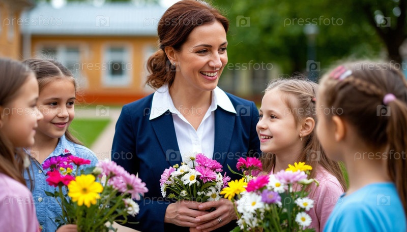 Учительница и счастливые ученики рядом со школой. Начало учебного года. ИИ